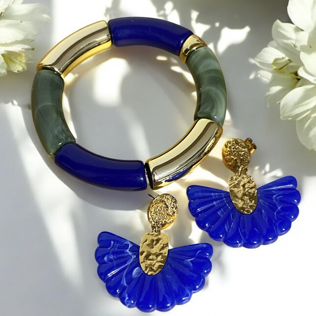 on craque pour ces BO avec pendentif éventail en résine bleu roi et clous martelés en acier inoxydable .
